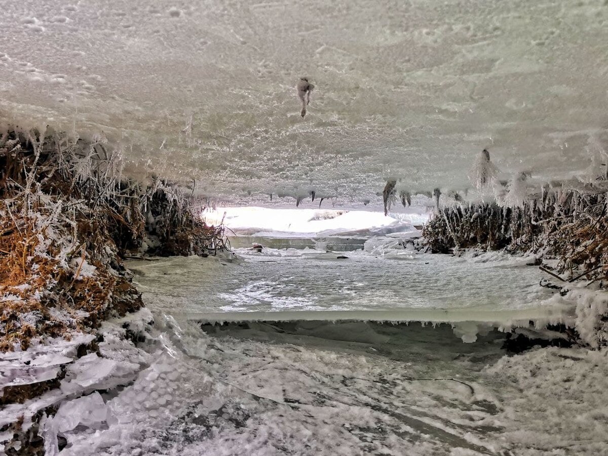 "Смотри, здесь рыба!" - раздалось из-подо льда. Рыбы там было навалом. Она повмерзала в лёд, который потолком поднимался над нами. Сегодня мы ходили на небольшую речку, прозрачным льдом которой любуемся уже много лет. Но сегодня было настоящее чудо. За с виду небольшим разломом открылось целое подводное ледяное царство. Оказывается, толстый лёд у нашей реки в этом месте (может, и в других тоже) не касается дна, и под ним достаточно места, чтобы даже взрослый человек мог пройти, согнувшись. Во льду кто-то на небольшом расстоянии друг от друга вырубил квадратные лунки. Спуститься вниз или подняться наверх можно было в том числе через них. Там, внизу, под замёрзшей толщей воды, сильно пахнет рыбой. Прогулявшись и рассмотрев причудливые снежинки и фигуры из льда, мы пошли к выходу. Над рекой было ослепительное солнце, которое множилось в отражении миллиардов снежинок.