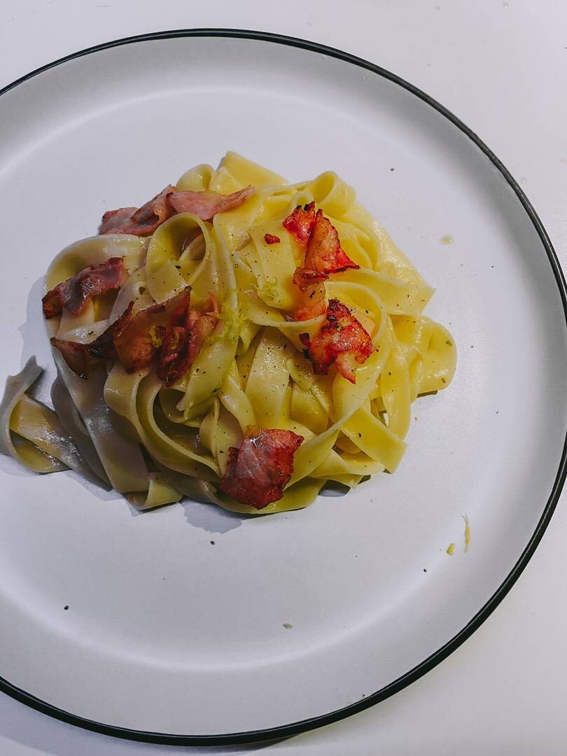 #фетучини #паста Ингредиенты: паста фетучини, овощной бульонный кубик, сливочное масло, чеснок, цедра лимона, бекон (количество на ваш вкус), оливковое масло, сыр, чёрный перец Способ приготовления: Отварить фетучини в воде с овощным кубиком. В это время на разогретой сковороде с высокими краями обжарить бекон в оливковом масле. Убрать бекон в отдельную емкость. За 5 минут до готовности пасты, добавляем в разогретую сковороду сливочное масло и измельчённый чеснок. Выкладываем фетучини в сковороду с маслом и чесноком и добавляем половником овощной бульон в котором варилась паста. Перемешиваем, убавляем огонь до ниже среднего. По одному половнику продолжаем добавлять бульон к пасте, так чтобы паста не была сухой, но и не плавала как в супе. Добавляем цедру лимона и чёрный перец. Хорошо перемешиваем с помощью кухонных щипцов. Раскладываем пасту по тарелкам, добавляем жареный бекон и посыпаем сыром. Наши фетучини готовы. ПРИЯТНОГО АППЕТИТА 😋