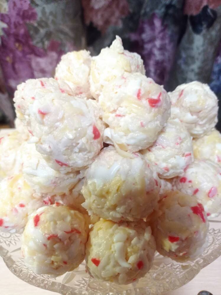 Мировая закуска и детям и взрослым, мини вариант Крабового салата Приятного аппетита 😗👌💕 Ингредиенты: крабовых палочек, круглого риса, яйца, сыра полутвердого, майонеза Способ приготовления: Рис и яйца отварить и остудить. Яйца, крабовые палочки и сыр натереть на крупной тёрке. Добавить рис и майонез. Всё перемешать и скатать шарики, при желании можно положить внутрь половинку оливки или обкатать в измельчённых чипсах. Приятного аппетита 💛😗👌✨