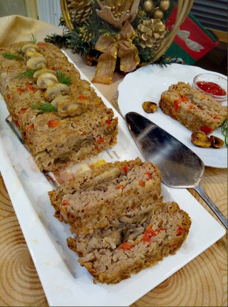 #рождество Мясной хлеб — национальное блюдо Германии и Бельгии. Мне очень нравится это блюдо и я часто готовлю мясной хлеб или мясной рулет на праздники. Блюдо смотрится очень эффектно, а еще это очень вкусно и сочно! Мясная буханка из фарша готовится просто - быстрей чем котлеты. А получается полезней и вкусней. В данном случае фарш использовала смешанный, а начинка из обжаренных шампиньонов вписывается идеально в это блюдо. Вкусно как в горячем, так и в холодном виде! Ингредиенты: мясной фарш (свинина-говядина), кусочек белого хлеба, шампиньоны, чеснока, болгарский перец, репчатый лук, соевый соус, томатный кетчуп, соль, перец, растительное масло Способ приготовления: У белого хлеба отрезать корочку. Замочить в небольшом количестве молока и оставить минут на 15. После истечении времени отжать. Молоко вылить. Репчатый лук очистить. Обжарить на растительном масле до золотистости. Болгарский перец очистить от семян и плодоножки. Добавить к луку в сковороду и обжарить еще вместе 3-4 мину