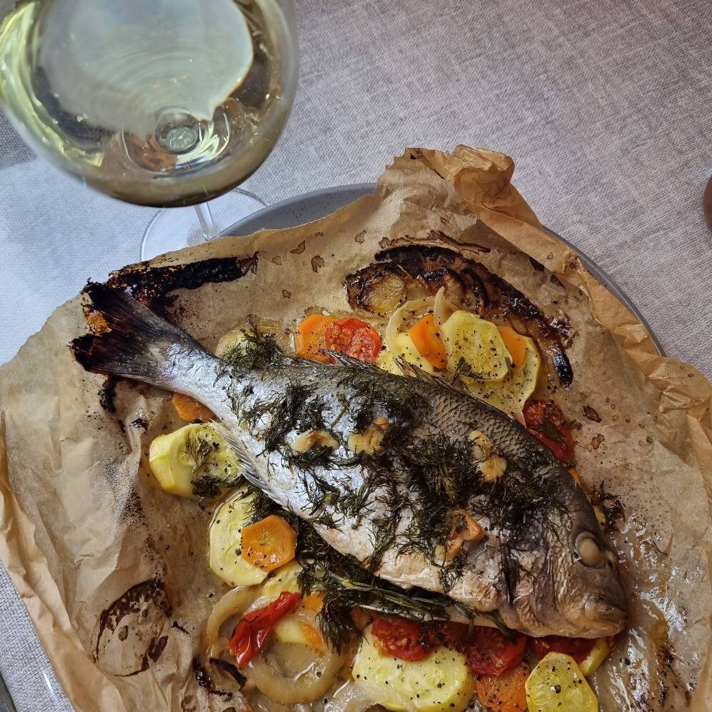 Как же я люблю дорадо (сибас) на овощной подушке Ингредиенты: Дорадо (сибас), морковь, цукини, маленькая головка лука, чеснока, помидоры черри, белого вина, Соль, перец , укропа, сливочного масла Способ приготовления: Подготавливаем все необходимые продукты: чисти моем. Разрезаем на пополам помидоры черри. Разрезаем на дольки цукини, морковь, лук. Делаем овощную подушку. На пергаментной бумаге: на овощную подушку выкладываем рыбу. Рыбу фаршируем стеблями укропа, сверху выкладываем сливочное масло с мелко порубленным укропом. Солим, перчим по вкусу. Формируем из пергаментной бумаги конверт, добавляем вино. Убираем в духовку на 20-30 минут, при 170°С. Достаем из духовки рыбу, разворачиваем пергаментную бумагу очень аккуратно. Приятного аппетита.