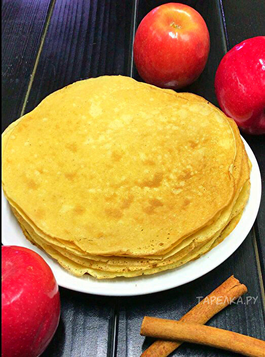 Такие блинчики готовятся не сложнее обычных. Но добавление в них яблок придает им приятную кислинку и аромат. Поэтому советую вам приготовить такие блинчики. Это будет просто идеальный завтрак. Приготовление: Для таких блинчиков подойдут любые яблоки, но лучше взять с кислинкой. Яблоки мою, очищаю от кожуры и семян и нарезаю кусочками. Перекладываю яблоки в глубокую миску, добавляю к ним молоко и яйца. Измельчаю содержимое миски с помощью погружного блендера до однородной массы. Если нет погружного блендера, не беда. Можно яблоки натереть на мелкой терке и смешать с яично-молочной смесью. Но мне больше нравится такой способ измельчения яблок. Итак, все пробила блендером. А дальше все, как при приготовлении обычных блинов. В смесь добавляю растительное масло, сахар и соль. Все хорошо перемешиваю до растворения сыпучих продуктов. Теперь добавляю просеянную муку и разрыхлитель. Опять перемешиваю, чтоб не осталось комочков. Это можно сделать миксером или венчиком. Ну и конечно корица, к