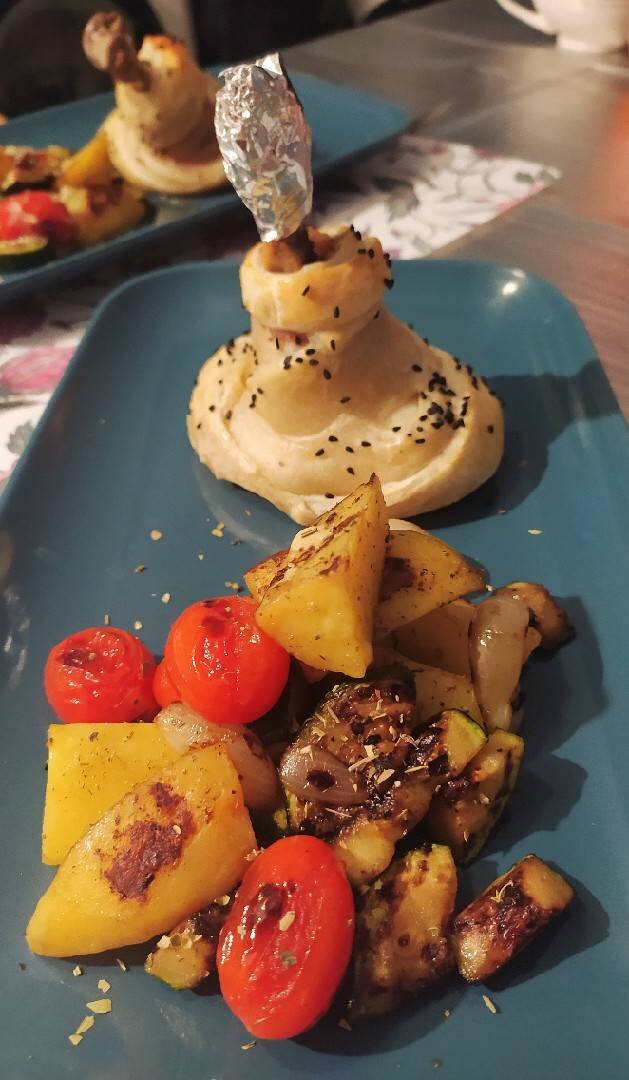 Простое, но очень вкусное блюдо #блюдоизкурицы #горячееблюдо #курицавтесте Ингредиенты: куриные окорока, слоёного теста, Ферментного сыра, моцареллы, Консервированные каперсы , Соль, смесь перцев, копченая паприка, порошок из сушёного чеснок, Яйцо, Черный сезам для посыпки, Гарнир, Цукини, Луковица, Помидоры черри, Отварной картофель Способ приготовления: Отварить в подсоленной воде куриные окороки. Отваренные окороки обтереть специями. Сыры натереть и смешать с каперсами. Лист теста немного раскатать и сделать с каждого угла поперечные надрезы. На дно выложить немного смеси сыров и косточкой вверх поставить куриный окорок, обернуть тестом как бутон. Косточку обернуть фольгой. Смазать тесто взбитым яйцом и посыпать черным кунжутом. Гарнир: цукини, лук и картофель нарезать крупно. Обжарить на гриле или на сковороде гриль на большом огне, добавить помидоры и посолить по вкусу.