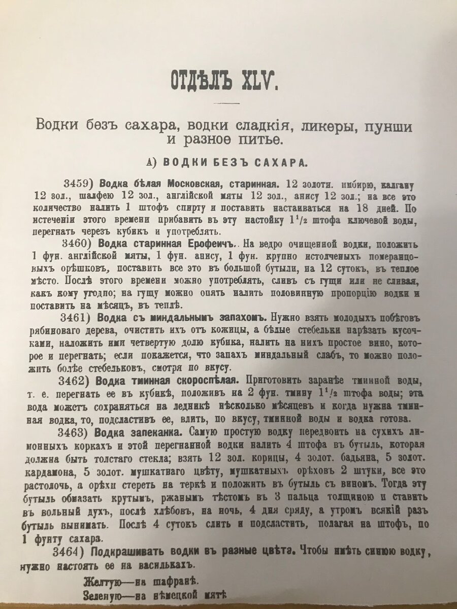 Я прекрасно понимаю, что многие из этих рецептов, это не рецепты самогона. Но чтобы совместить их с форматом канала, назовем их так. И это просто интересно. Один из рецептов Елены Молоховец из книги “Подарок молодым хозяйкам…” от 1875 года. Сначала оригинальный рецепт, потом адаптированный уже в наше время. Долго пытаюсь купить книгу Молоховец 1875 года. Но там продавец странный. Поэтому чтобы быть абсолютно честным эту страницу я взял с сайта ларец-кулинарный.ру. Это если по русски. Водка белая Московская, старинная. 12 золотников имбирю, калгану 12 золотников, шалфею 12 золотников, английской мяты 12 золотников, анису 12 золотников; на все это количество налить один штофъ спирту и поставить настаиваться на 18 дней. По истечении этого времени прибавить в эту настойку 1,5 штофа ключевой воды, перегнать через кубикъ и употреблять. Водка белая “Московская”, старинная. Взять по 50 гр. имбиря, калгана, шалфея, мяты, аниса, залить 1,2 литра спирта и поставить настаиваться на 18 дней. По и