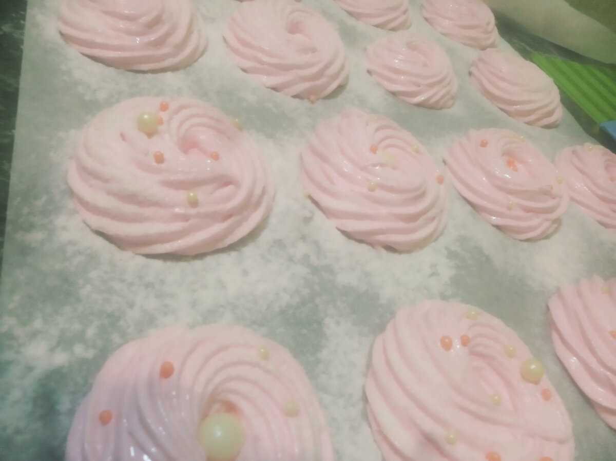 Ингредиенты: Клюква-200 гр. Яблоки-2 шт. Сахар-650 гр. Яйцо-1 шт. Агар-агар-9 гр. Вода-170 мл Сахарная пудра для посыпки Приготовление: 1. Яблоки разрезать пополам, удалить сердцевину и выпекать в духовке примерно 15-20 минут. 2. Клюкву пробить блендером,смешать с мякотью яблока,и поставить на огонь. Довести до кипения,и протереть через сито. 3. 50 гр. Сахара смешать с агар-агаром и убрать в сторону. 4. Оставшийся сахар смешать с водой и поставить на огонь. Довести до кипения,и добавить сахар с агар-агаром,прогреть до 110 градусов. 5. Взбить яичный белок,добавить клюкву. 6. Влить тонкой струйкой нагретый сахар в белок с клюквой. Взбивать до устойчивости. 7. Переложить смесь в кондитерский мешок с насадкой и отсадить на пергамент. Оставить на 5 часов,лучше на ночь. Посыпать сахарной пудрой.