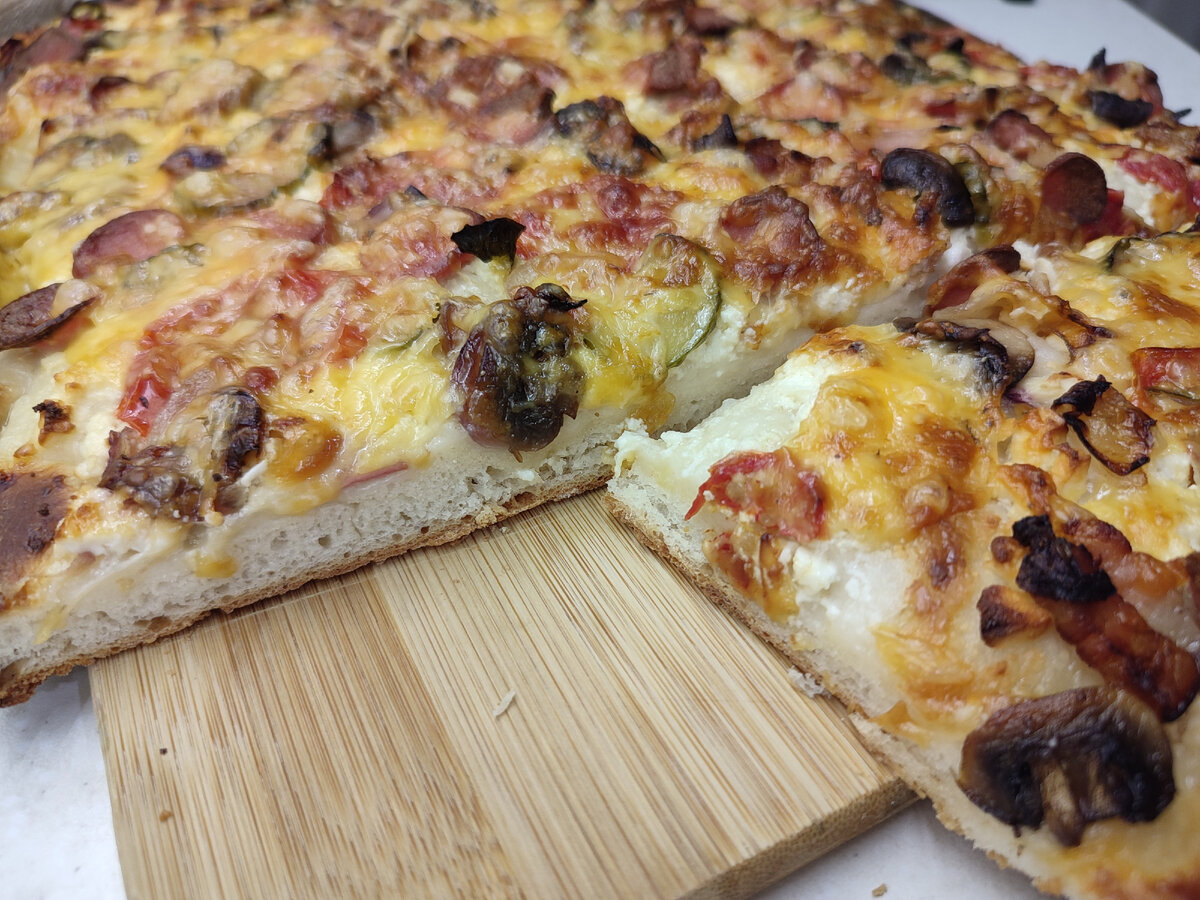 Тесто на этот пирог-пиццу получается воздушное. Если хочется тонкой пиццы, то ингредиенты лучше разделить на два. Тесто отлично подойдёт и на пирожки. Ингредиенты: Для теста: Молоко - 400 мл Дрожжи сухие - 1 ст. л. без горки Сахар - 2 ст. л. без горки Соль - 1 ч. л. Растительное масло - 3 ст. л. Мука - 550-600 г Для начинки: Плавленый сыр- 50 г Грибы - 100 г Лук репчатый- 1 шт. Помидоры- 1 шт. Огурец маринованный - 1 шт. Сосиска/колбаса - 100 г Грудинка - 50 г Сыр - 150 г Способ приготовления: 1. Молоко слегка подогреть, чтобы стало чуть теплым 2. Подготовить сухие ингредиенты- сахар, соль, дрожжи. 3. Смешать всё в теплом молоке 4. Добавить к смеси 6-7 ложек муки и отправить в тёплое место на полчаса. 5. Масса поднялась, всё растворилось, можно приступить к вымешиванию теста. 6. Добавляем муку, сначала венчиком, затем вымешиваем тесто руками. 7. В процессе добавляем две ложки масла. 8. Последнюю ложку масла добавляем, когда вся мука использована и месим ещё. После опять отп