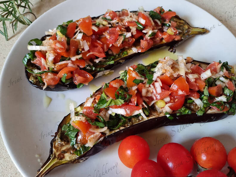 #рождество #баклажаны Замечательный рецепт от Юлии @guaka_molly - спасибо огромное! Настоящее "гастрономическое счастье" :). Нам очень понравился, и хотя в наличии был только один баклажан, оценили по достоинству - на Рождество приготовлю больше, будет украшением стола. Рецепт привожу полностью авторский с моими маленькими отступлениями. Ингредиенты: маленьких баклажан (пополам вдоль), соуса песто (у меня домашний), красных помидор черри (мелкий кубик), желтых помидор черри (мелкий кубик) (у меня не было, только красные), чеснока (мелко), красного лука (мелко) (у меня лук порей), каперсов (мелко), Соль, перец чёрный, перец острый красный, Оливковое масло, Белый винный уксус, Базилик зелёный (мелко) Способ приготовления: Баклажаны надрезали как на фото, смазали тонким слоем соусом песто и в духовку 200 гр С на мин 40-45. У меня баклажан приготовился быстрее, поставила его на выпечку с конвекцией. Ориентируйтесь по своей духовке. В это время приготовьте томатную сальсу. Помидоры, лук, ка