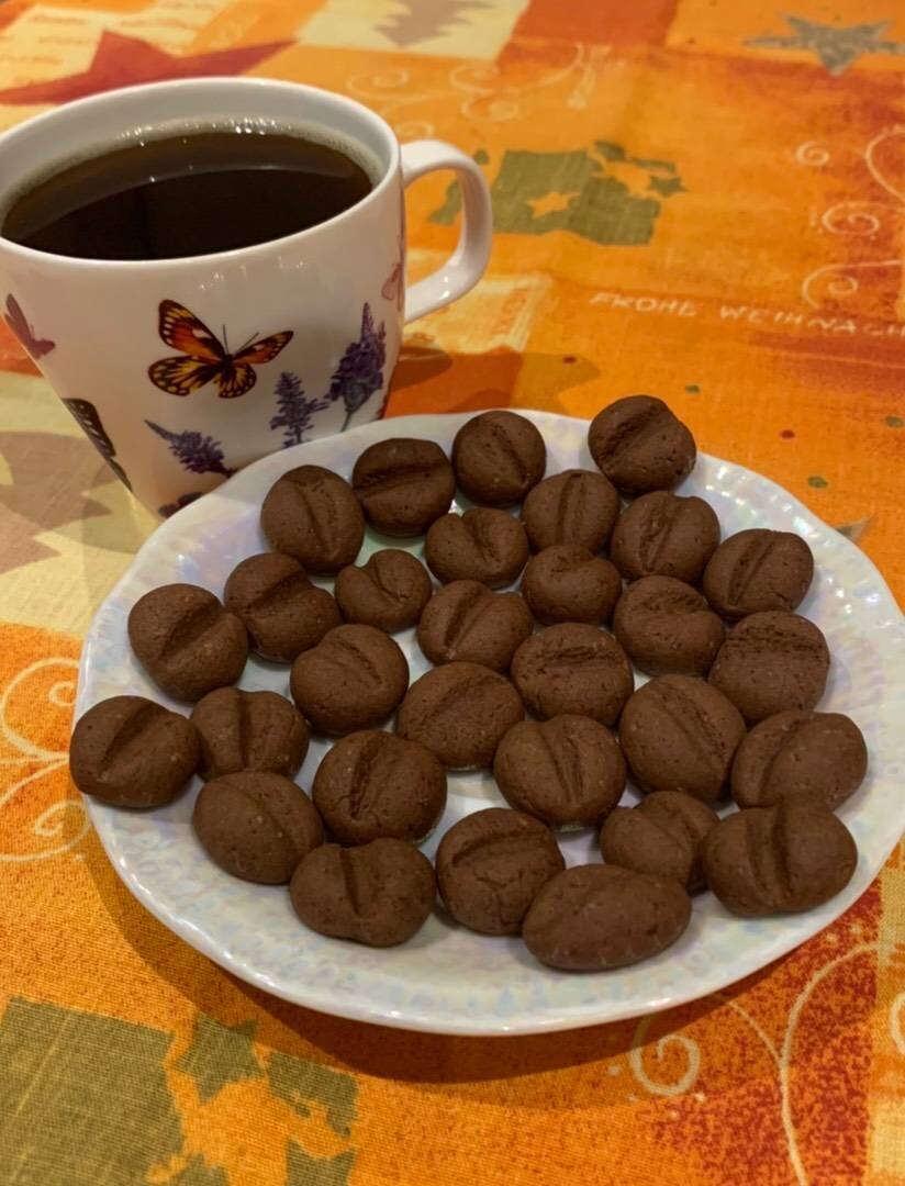 Вкусное печенье. Спасибо за хороший рецепт @Madina_cooking Ингредиенты: сливочного масла комнатной температуры, сахарного песка, яйцо, сметаны, соли, муки, какао порошка, разрыхлителя теста, растворимого кофе Способ приготовления: Масло комнатной температуры. (Если холодное, то ставим в микроволновку мощность 30 на 1 минуту.) Сливочное масло перетираем толкушкой с маленькой щепоткой соли и сахарным песком, затем взбиваем миксером. Добавляем яйцо и взбиваем миксером. Добавляем сметану и взбиваем. Теперь добавляем сухие ингредиенты: просеянную муку, разрыхлитель, растворимый кофе, какао порошок. Замесить тесто и убрать в холодильник на 2 часа, накрыв пищевой плёнкой. Тесто должно получиться, как мягкий пластилин. Вытаскиваем тесто, отрываем от него понемногу и катаем в ладонях сначала шарик, а затем овал. Обратной стороной ножа продавливаем посередине полоску, но не насквозь. Выкладываем печенье на противень, застеленный бумагой для выпечки, которая смазана растительным маслом. Выпекаем