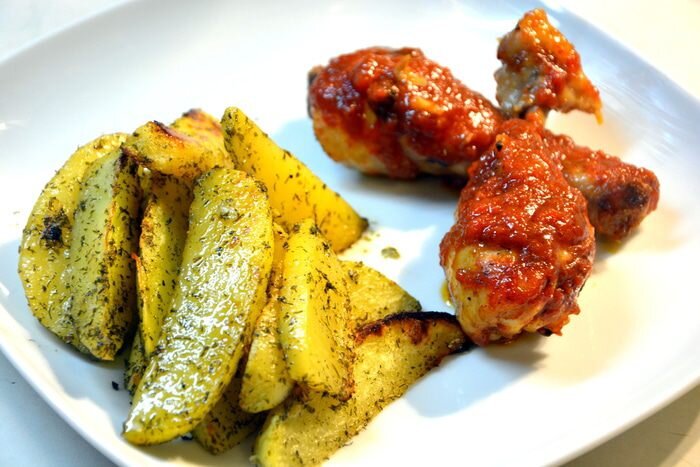 Готовлю часто быстрый и вкусный ужин. Соус похож на соус-барбекю, но облегченный вариант :) Голень куриная - куриные голени : 6 шт., оливковое масло Extra Virgin : 2 ст. л., кетчуп томатный : 200 г, мед : 1 ч. л., винный уксус красный : 1 ст. л., соль : по вкусу, перец : по вкусу. Гарнир - картофель : 8 шт., укроп сушеный : 1 ч. л., петрушка сушеная : 2 ч. л., соль : по вкусу, перец : по вкусу, оливковое масло Extra Virgin : 4 ст. л., чеснок : 6 зубчиков. Голень промыть и просушить бумажным полотенцем. Смешать все ингредиенты для соуса: кетчуп, оливковое масло, мед, винный уксус, соль, перец. Залить голень соусом и перемешать. Выложить в блюдо для запекания. Выпекать в хорошо разогретой духовке при 200°С 45-50 минут. Время от времени поливать голень соусом. Картофель почистить, разрезать на дольки, промыть и просушить на бумажном полотенце. Смешать ингредиенты для соуса: оливковое масло, укроп и петрушка сушеные, соль, перец и раздавленный или мелко рубленый чеснок. Добавить соус к кар