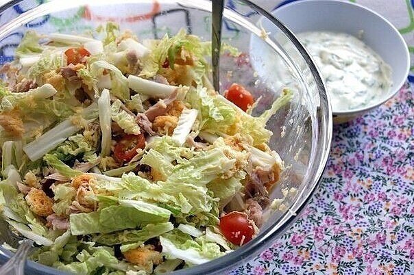 Салат"Цезарь" по русски Ингридиенты: Куриная грудка(филе) Капуста"Пекинская" Сыр твёрдого сорта- на ваш вкус Сухарики Помидоры Для соуса: Майонез Чеснок Зелень Лимон Я намеренно не указываю количество продуктов-тут как кто любит, чего то побольше, чего то поменьше на ваше усмотрение. Приготовление салата: 1. Сперва готовим курицу. Можно либо просто отварить, либо можно уже отварную, слегка обжарить до золотистого цвета. Далее, пока курица варится, режем капусту тонкими полосками.После капусты режем помидоры небольшими дольками. Сыр необходимо натереть на мелкой тёрке. К этому времени наша курочка уже сварилась. Нужно её разобрать на небольшие кусочки(вдоль волокон). 2. Теперь приступаем к соусу. В блендере измельчаем пару зубчиков чеснока с зеленью добавляем майонез и пару капель лимона и доводим все до однородного состояния. Пробуем-кто-то любит по больше или по меньше чеснока или лимона это уже на ваше усмотрение. Всё это можно проделать и в ручную без блендере. 3. Вни