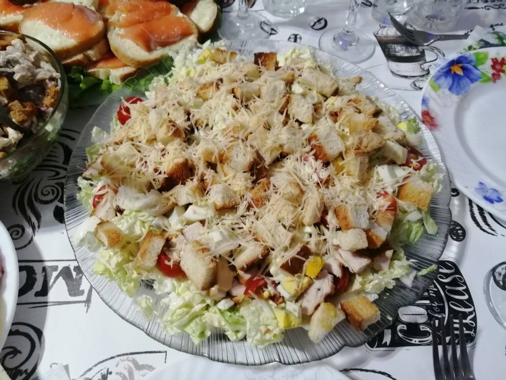 Ингредиенты: Пекинская капуста, Помидоры черри, Сыр твёрдых сортов , Куриная грудка, Яйца куриные, Хлеб белый, Соус для салата Способ приготовления: Пекинскую капусту нарезать мелко, заправить соусом. Грудку обжарить обжарить, порешать выложить на листья капусты. Помидоры черри порезать, яйца, сухарики из белого хлеба. Посыпать натёртым сыром.