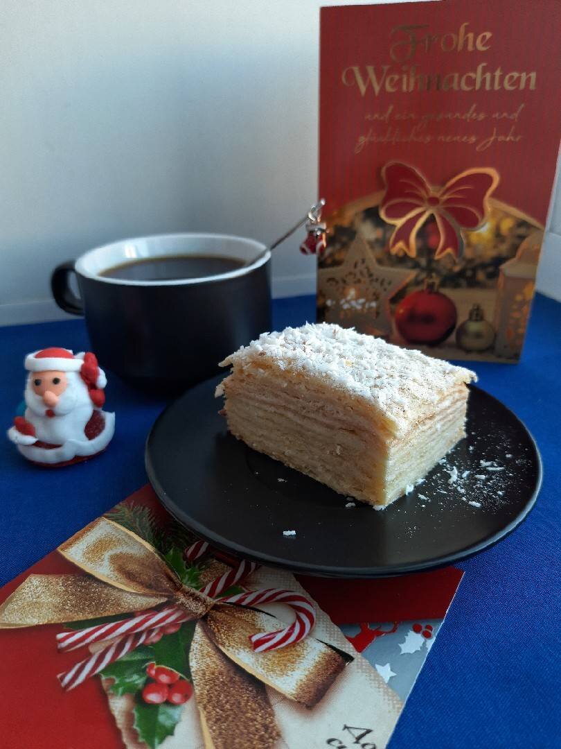 Быстрое слоёное тесто и заварной крем – пломбир – сказочное сочетание, в которое влюбляешься с первого укуса! Ингредиенты: Для теста:, муки, сливочного масла, воды, яйцо, уксуса (9%), соли, Для крема:, молока, сливок, яйцо, сахара, сливочного масла, кукурузного крахмала, ванильного сахара, Для украшения:, Панировочные сухари – по вкусу, Кокосовая стружка - по вкусу Способ приготовления: Готовим тесто. В стакане взбейте до однородной массы яйцо, уксус и соль Влейте в яичную смесь ледяную воду. Доливайте столько, чтобы до кромки осталось 5 миллиметров. Всё хорошо перемешайте и уберите стакан в холодильник В глубокую миску просейте муку и нарежьте маленькими кусочками холодное масло. Перетрите руками в крошку Сделайте лунку в крошке и влейте туда холодную яичную массу (из холодильника). Быстро перемешайте, чтобы крошка впитала влагу. Затем переложите на стол и ладонями быстро собирайте крошку в шар. Долго не месите (если перемесить, то торт не получится слоистым) Разделите тесто на 10 рав