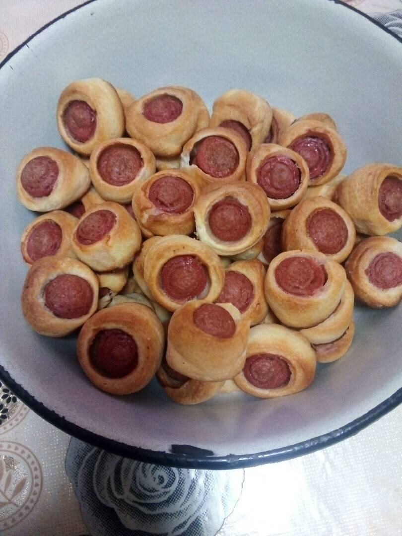 Ингредиенты: слоёного дрожжевого теста, сосисок, растительное масло для смазывания Способ приготовления: Распечатать тесто, раскатать в длину. Очистить от пленки заранее сосиски и все сосиски обвернуть в тесто после каждую сосиску порезать на колечки толщиной 1-2 см. На противень выложить пергамент смазать растительным маслом разложить медальки и выпекать в разогретой духовке при температуре 180 градусов до готовности, готовые медальки переложить в чашу. Готово. Приятного аппетита.