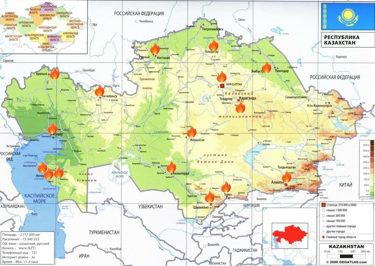Реакция властей на эти события также была беспрецедентной для "майданного" пространства СНГ, было де факто введено военное положение с вводом военной техники и введением комендантского часа. Ограничен оборот средств которые могут быть использованы для изготовления "коктейля Молотова" , вводится ограничение на интернет, закрыты оружейные магазины. Но всем этим не сокрыть провал властей Казахстана в управлении страной. Де факто ей управляют другие люди. Для "сброса пара", власти Казахстана были вынуждены были вбросить "дезу" об отставке Токаева и пойти на снижение цен на газ и топливо для автомобилей. Но при всём при этом мы присутствуем только в начале событий. Проблема Казахстана в том, что огромная территория в отличие от той же Белоруссии, не имеет жёсткого оперативного покрытия, силовики не контролируют экстремистов так, как это делают силовики "батьки". Сетевая структура "Демократического выбора Казахстана" может оказаться куда прочнее, нежели кажется. И в этом также сть существенный провал российской политологии, которая сосредоточившись на Украине и США практически упустила из виду Казахстан и Центральную Азию. А теперь посмотрите на карту.