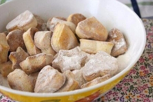 Ингредиенты: Сливочное масло (размягченное, к. т.) — 100 г Сметана любой жирности — 200 г Сахар — 0,75 стак. Ванильный сахар — 1 ст. л. Яйца — 2 шт. Мука — 3,5 стак. Разрыхлитель (можно заменить 0,5 ч. л. соды, размешать в сметане)— 1,5 ч. л. Сахар (мак, изюм, сахарная пудра) — по желанию Приготовление: 1. Муку просеять и соединить с разрыхлителем. Яйца взбить с сахаром при помощи венчика. 2. Добавить размягченное сливочное масло и перемешать. 3. Добавить сметану и еще раз хорошо перемешать. Постепенно всыпать в яично-сметанную массу муку с разрыхлителем и замесить мягкое некрутое тесто. Тесто при замесе липнет к рукам. Ввести в тесто достаточное количество муки, чтобы из теста можно было сформировать шар, хорошо подпылить тесто мукой со всех сторон и положить в полиэтиленовый пакет. Тесто убрать в холодильник на 2–3 часа. 4. Готовое охлажденное тесто раскатать на посыпанном мукой столе в пласт толщиной 8 мм–1 см и вырезать формочкой (обмакнув формочку в муку) или рюмкой печенье. Если