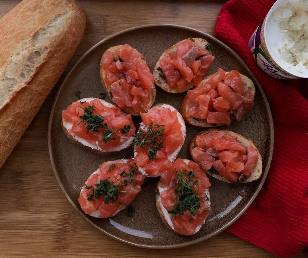 После новогодних праздников осталось много красной рыбы и я нашла ей применение🥪 Для идеальной брускетты понадобится еще чеснок, которым натирают багет после подсушивания и оливковое масло, которым сбрызгивают тот же хлебушек. Но я сделала немного по-другому. Идеально под игристое🥂. #бутерброд #брускетта #краснаярыба #закуска #посиделки #длядрузей #подфильм #форель #лосось #слабосоленаярыба #подигристое #подшампанское #быстровкусно #творожныйсыр #сливочноемасло #тост #кчаю #рыба #рыбныйдень #рыбныйчетверг #багет Ингредиенты: Слабосоленой красной рыбы (у меня лососевая форель), Маленький свежий пшеничный багет, Сливочное масло, Творожный сыр, Свежий укроп Способ приготовления: Рыбу нарежьте на маленькие кусочки или пласты. Багет нарежьте толщиной 1,5-2 см и просушите на а/п сковороде без масла, огонь сделайте самый слабый. Так же можно использовать тостер. Несколько кусочков хлеба смажьте сливочным маслом и посыпьте мелкорубленным укропом, другие кусочки смажьте творожным сыром. Вылож