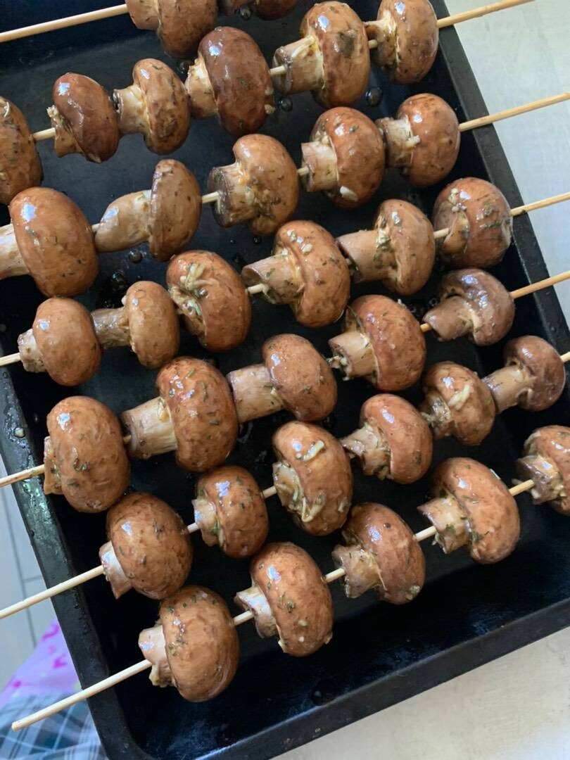 Ингредиенты: грибов, чеснока, оливкового масла, соевого соуса, винного уксуса, горчицы, соли, черный перец, сушенного укропа, итальянских трав Способ приготовления: Грибы помыть, чеснок натереть. Уложить грибы в пакет, добавить туда чеснок и все специи. Завязать пакет, хорошо потрясти, чтоб специи равномерно распределились. Оставляем мариноваться в пакете на 30 минут. Нанизываем грибы на шпажки и запекаем в духовке при 220 градусах 15-20 минут.