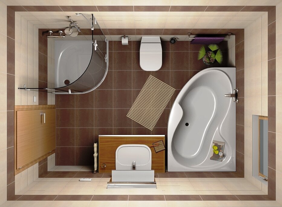 В небольшом помещении сантехническое оборудование располагают вдоль стен, оставляя центр свободным. В этом случае использование угловой ванной поможет немного сэкономить место.