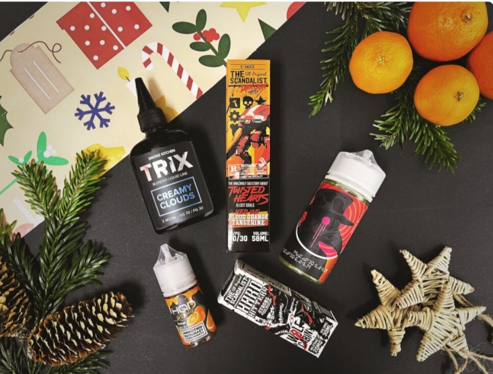 Жидкости с ароматом цитрусовых Новый год – это, конечно, мандарины. В нашей коллекции собрались все самые сладкие и ароматные цитрусы, поэтому выставим их на новогодний стол: Список жидкостей: 1. Twice On Ice SALT - Guava Tangerine 30мл. Twice on Ice SALT это освежающая линейка летних миксов с солевым никотином. В маленьких ярких флакончиках скрывается такая же яркая жидкость со вкусом спелых ягод и фруктов, дополненных хорошей порцией бодрящего кулера. 2. SK TRIX - Creamy Clouds 100мл Это целая линейка нетривиальных миксов, качественных и вкусных, впрочем как и всегда, это же Смок Китчен. Здесь вас будут ждать самые разные сочетания, найдется и табачка, и десерты, и даже глинтвейн. Ну и без секретного вкуса не обошлось. 3. The Scandalist - Twisted Hearts 58мл Жидкость The Scandalist это линейка от компании RUVAPES, что начали покорять отечественный (и не только) рынок с 2015 года. Вкусовые сочетания тут достаточно разнообразны, имеются как крутые жвачки, так и десерты, и много чег