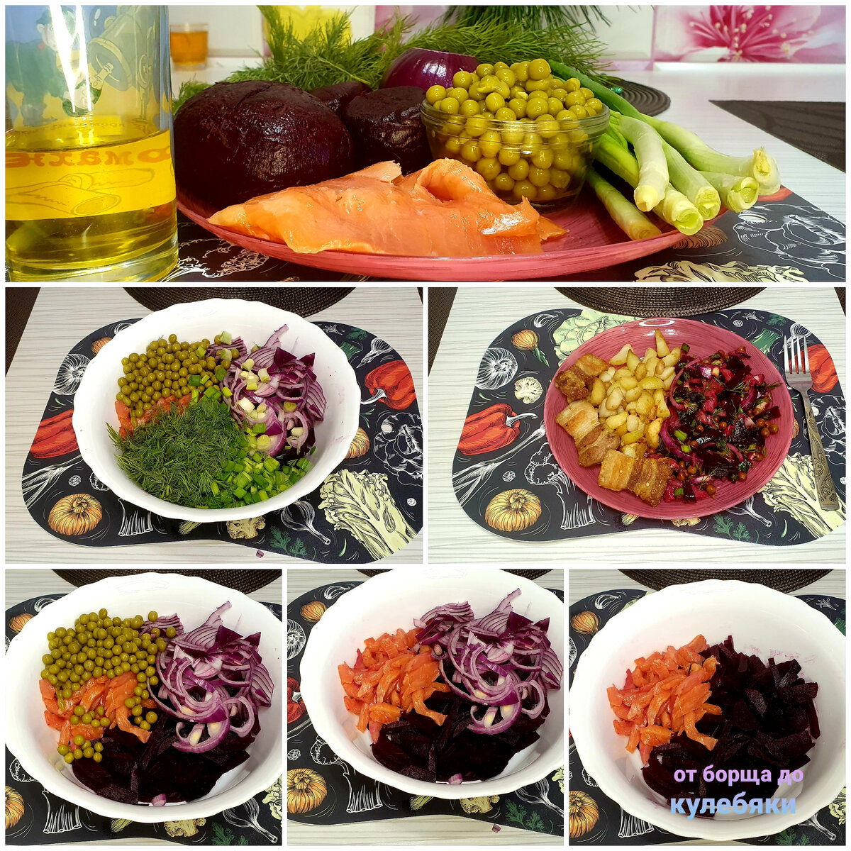 Из несложных рецептов этот - мой самый любимый! Надеюсь, что и вам он тоже понравится, ведь он не только вкусный, но и полезный, кроме этого, очень красиво смотрится на праздничном столе. Приступаем! Нам понадобятся: Свеклу отвариваем и режем на соломку, или кубики. Красную рыбу тоже режем на небольшие кусочки и кладём вместе со свеклой. Лук режем на полукольца и отправляем в общую массу. Туда же кладём зелёный горошек. Добавляем мелко порубленный укроп и зелёный лук. Остаётся заправить растительным маслом, добавить немного соли и хорошенько перемешать. Салат готов, можно подавать на стол! Понравился вам этот рецепт, или нет? Ответы жду в ваших комментариях. Ставьте лайки и подписывайтесь на мой канал "От борща до кулебяки" и вы узнаете много вкусных и интересных рецептов. Желаю вам всего наилучшего, друзья мои! Добра, тепла, моря улыбок и приятного вам аппетита!