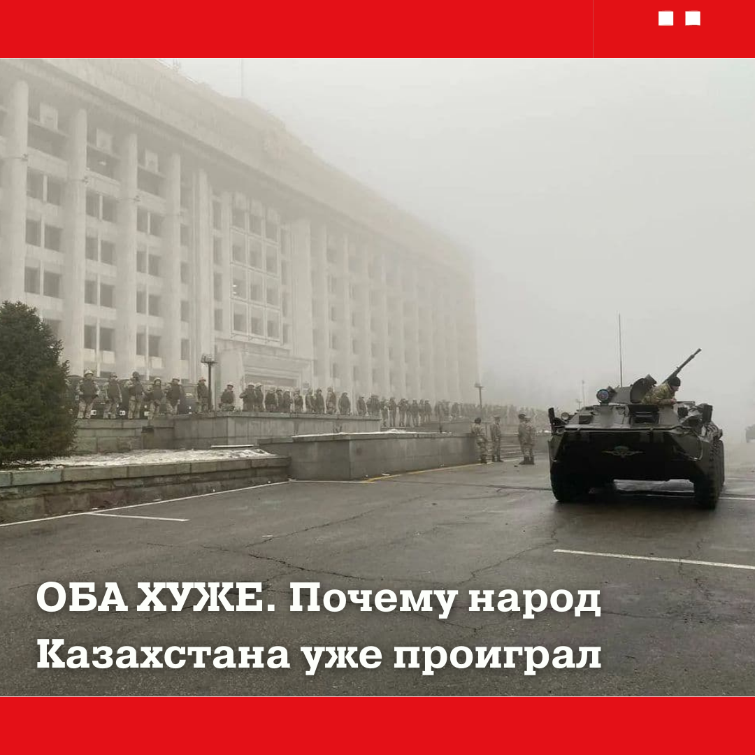 Заместитель главреда «Репортёра» Павел Волков о беспорядках в Казахстане. #колонка #казахстан Захват правительственных зданий, штурм офиса правящей партии, появление огнестрела у протестующих, частично блокировка работы правоохранителей, частично переход их на сторону протеста, частично избиение нацгвардии и, самое главное, замена требований снизить цены на газ (их снизили) на новые «честные» выборы. Пока только в Жанаозене, но мы знаем, что такое Жанаозен и какие претензии имеются у рабочих этого города нефтяной промышленности к властям. Никакой отставки правительства никогда не хватает, никаких выполнений экономических требований никогда не хватает. И, с одной стороны, это правильно, поскольку любое следующее правительство будет таким же, как и предыдущее, а цены в перспективе поднимать все-равно продолжат, т.к. инфляция — не баг, а фича системы. Но штука вся в том, что такого рода протесты меняют не систему, а лишь кровати в известном увеселительном заведении. Самые новые и самые