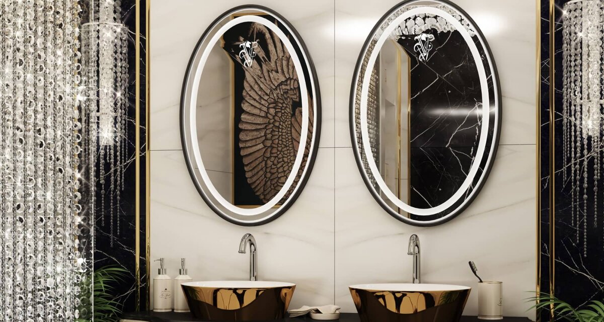 Чаши умывальников в ванной снабжены овальными зеркалами