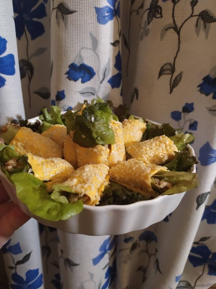 Ингредиенты: плавленый сыр пластинками, шампиньоны, филе куриной грудки отварное, репчатый лук, морковь, соль, молотый черный перец, майонез, листья салата, кунжут для обсыпки, чеснок Способ приготовления: Грибы (у меня ножки от шампиньонов),куриную грудку и лук все размолоть в блендере. Выложить на сковородку с растительным маслом, добавить морковку и чеснок и тушить до готовности морковки. Выложить, заправить майонезом (много не нужно) добавить соль и молотый перец и перемешать. Берём тарелку, насыпан чуть кунжута, выкладываем пластинку сыра, листик салата и готовую массу. Заворачиваем. Можно углом можно прямо, как нравится. Убираем в холодильник. Выкладываем на блюдо для подачи. Можно отдельно, можно с другими закусками. Приятного аппетита 😊.