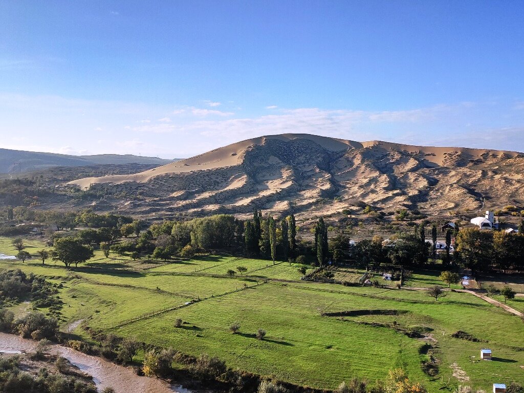 И еще про одно чудо в Дагестане – удивительно, но Дагестан действительно оказался полон сюрпризов. Тут и горы, и башни, и древние аулы, и каньоны. А напоследок еще и бархан. Самый настоящий, песчаный, и при этом крупнейший в Европе. Называется он Сарыку́м или Сары-Ку́м (Сари хум и означает «Желтый песок»). Находится совсем рядом с Махачкалой, всего в 18 км. Бархан в моем понимании – небольшая песчаная гора, которая передвигается по пустыне силой ветра. Но здесь все не так. Во-первых, размер. Этот #бархан огромный: длиной примерно 3 км и шириной до 1,5. Во-вторых, он никуда не движется: меняется только его верхняя часть, и поэтому высота его колеблется от 213 до 262 м. Существует множество гипотез его происхождения от самых фантастических, что мощный ураган перенес сюда песок из Средней Азии, до вулканических и, наконец, до наиболее реалистичных, о том, что сильный ветер постоянно выдувает песок из окрестных гор, сложенных из песчаника. Конечно, про такое необычное место сложено множест