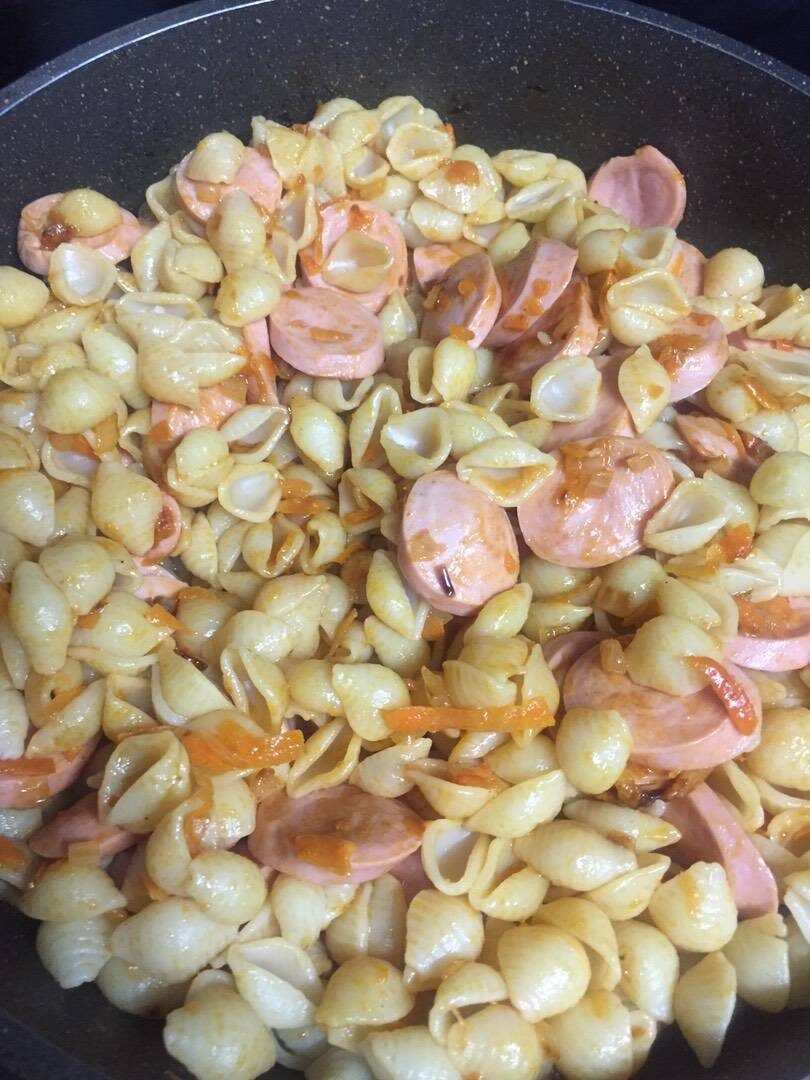 Рецепт который оценят ваши детки. Ингредиенты: макарон, луковицы, моркови, томатной пасты, сосисок, Соль, перец, зелень , яйцо Способ приготовления: Отварите макароны и сбросьте их в дуршлаг. Обжарить лук, морковь, добавить томатную пасту. Добавить к зажарке нарезанные сосиски. Все хорошо обжарить. К зажарке добавить макароны, перемешать, добавить одно яйцо и ещё раз тщательно перемешать, накрыть крышкой. После готовности можно добавить зелень. Приятного аппетита.