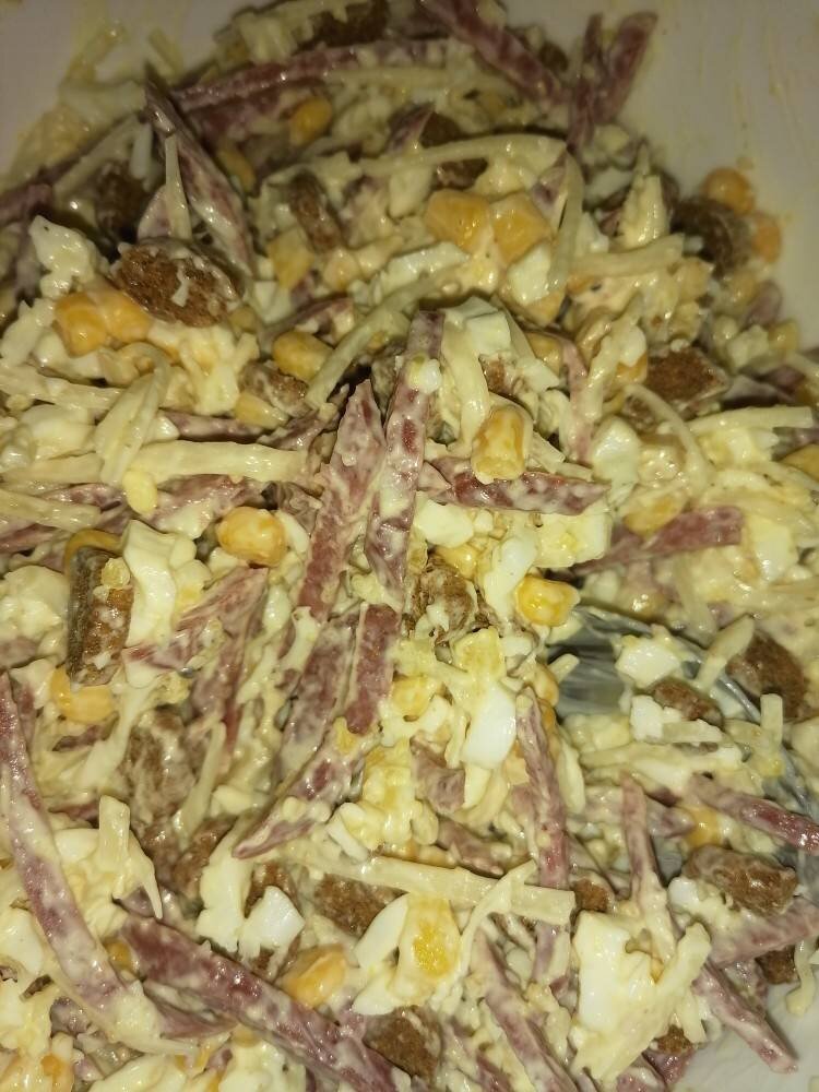 Ингредиенты: сырокопченой колбасы, отварных яйца, сладкой кукурузы, твёрдого сыра, сухариков, чеснока, Майонез Способ приготовления: Нарезать соломкой колбасу, сыр, высыпать кукурузу, выдавить прессом чеснок. Добавить яйца и сухарики. Майонез по вкусу. Быстро и вкусно. Приятного аппетита🙂🌲