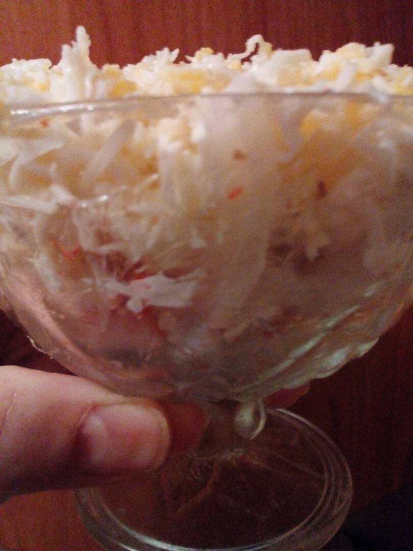 #новыйгод #рождество Сочный, нежный, праздничный салат Ингредиенты: крабовых палочек, куриных яйца, яблоко, луковица, плавленого сырка, растительного масла, лимонного сока, соли, сахара, майонеза Способ приготовления: Лук почистить, помыть, порезать тонкими полукольцами и замариновать. Для маринада взять соль, сахар, сок лимона, растительное масло. Оставить на 20 минут. Крабовые палочки очистить от пленке и натереть на терке, уложить на дно салатника. Крабовые палочки смазать майонезом и выложить лук. Смазать майонезом. Сыр очистить от фольги и натереть на терке. Выложить сыр, смазать майонезом. Яблоко помыть, почистить от коробочки, натереть на терке, выложить поверх смазанного сыра. Смазать майонезом. Яйца отварить, охладить, очистить, натереть на терке и посыпать сверху салат. Приятного аппетита. Буду рада видеть Ваш отзыв и Вас моим подписчиком, если понравился рецепт.