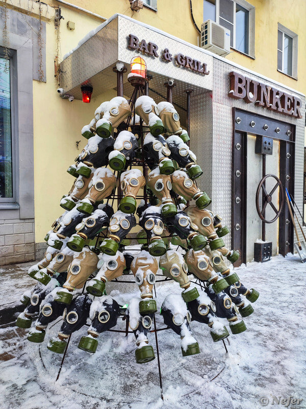 Погуляли по новогодней Рязани. Елки там креативные. Особенно на Мюнстерской площади. Издалека не поймешь, надо вблизи рассматривать. Я их подробненько сфотографировала. Но первой покажу вот такую елку из противогазов, увидела на Почтовой улице :) Около цирка елка, украшенная гербами. Тоже необычная, но по сравнению с остальными самая стандартная. Не все гербы я смогла узнать, точно помню Дагестан с птицей и Ямало-Ненецкий автономный округ, у них с оленем и белыми медведями. Всего должно быть 85. Оказалось, эту елку устанавливают каждый год, только меняют месторасположение, в прошлом году она находилась на площади Победы. Мюнстерская площадь. Насколько я понимаю, немецкий город Мюнстер является побратимом Рязани. Таким образом, в Рязани появился кусочек старой Европы - комплекс зданий, в котором расположились отель, бар и ресторан. Симпатично, но о них чуть позже, сейчас про елки. Они просто огонь! Яркая елка от компании Era Group привлекает к себе внимание. Присмотрелась, а она из вент