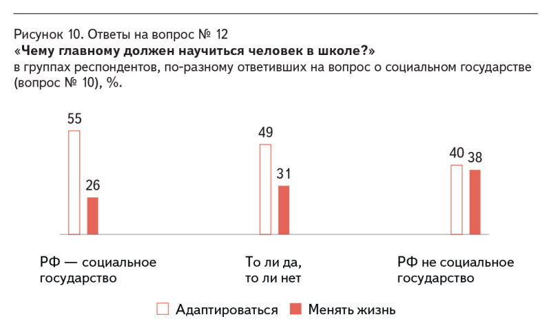 Зависимость от того, считаете ли вы Россию социальным государством, отражается уже на ваших ожиданиях того, чему школа должна научить ваших детей: менять мир или приспосабливаться к нему. Оказывается, иллюзия, что ты живешь в «социальном государстве», связана с социальной пассивностью: зачем активничать, если государство изо всех сил старается улучшить твою жизнь, и надо только рот вовремя открывать, чтобы туда попали все блага? Эта зависимость четко видна в том, как ответили на вопрос о цели школы люди, которые видят в РФ социальное государство и которые его не видят (рис. 10).