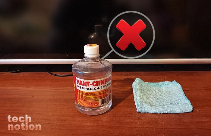 Для ухода за телевизором нельзя использовать средства, которые содержат аммиак, спирт и ацетон. Они могут повредить экран, в частности, антибликовую пленку, и исказить передачу цветов.