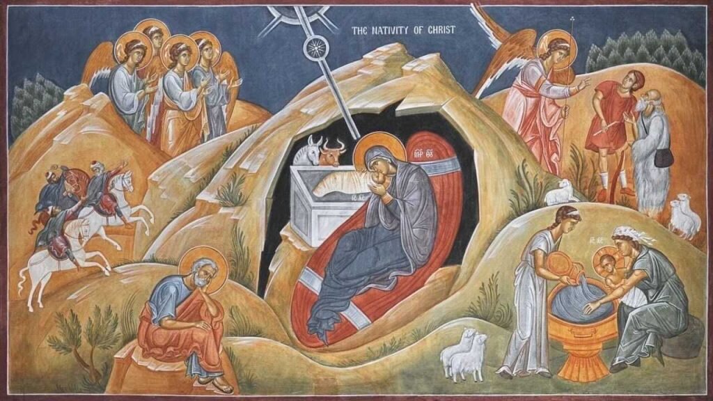 Неповторимая черта иконографии Рождества Христова – непосредственность передачи этого евангельского события в сочетании со множеством подробностей, со значительными иллюстрациями богослужебных и евангельских текстов.