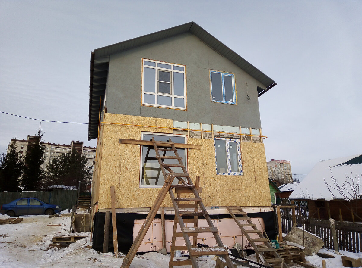 Зима продолжала свою жизнь показывая характер, а я боролся не смотря не на что - обжигающий щеки холодный ветер, мороз заставляющий чаще бегать в дом, чтобы согреть руки и все прелести зимы не помешали мне доделать работу. Две стены были готовы, оставалась часть третьей, задней стены, и вот что мне пришлось сделать там. на первый взгляд простая стена тоже имела трудности для работы, чтобы зафиксировать первый целиковый лист OSB, мне пришлось установить упоры, на горизонтальной линии нижней границы. Трудности при отделке этой части дома были связанный с ящиком в котором был установлен газовый счётчик, к стене дома он был зафиксирован на шпильки и чтобы их обойти, пришлось размечать и лобзиком вырезать прорези, а после монтажа и фиксации листов OSB, делать вставки, в итоге получилось как то так... Это был первый этап по отделке стен дома и спустя время работа продолжилась...