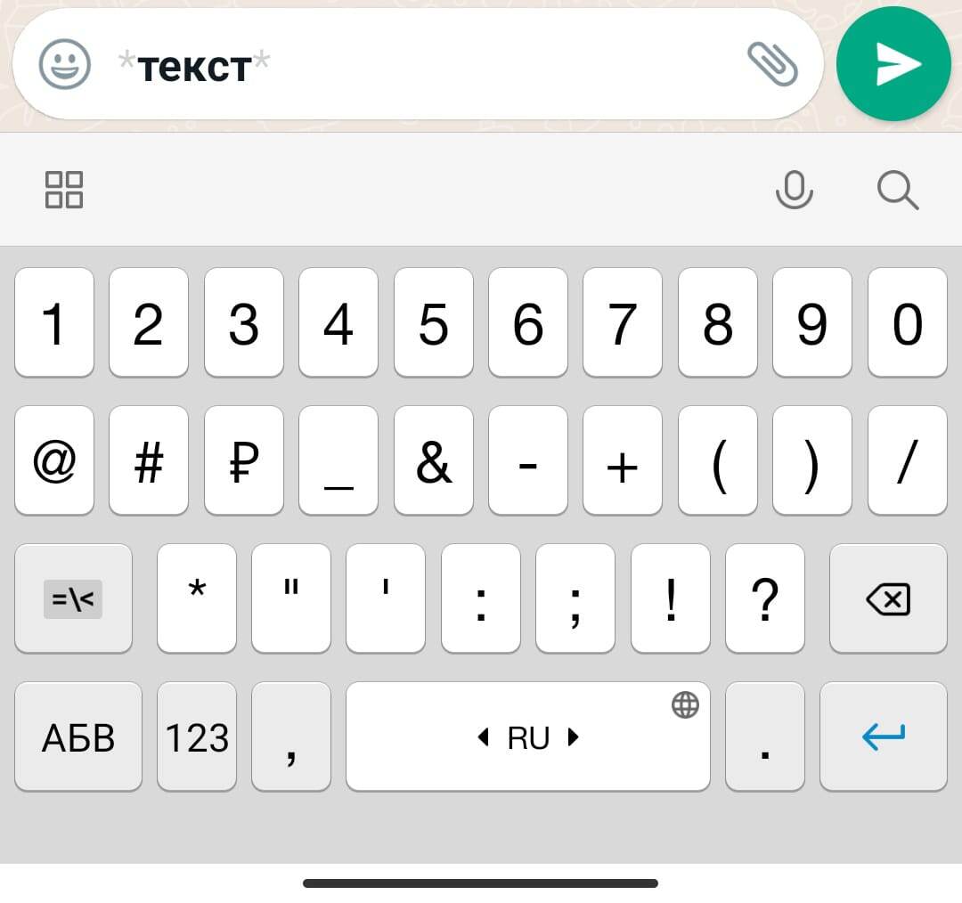 Хотите писать сообщения не как все. И хотите стать круче запоминайте. Если в начале и в конце сообщения поставить *текст* (Звездочки) то текст выделиться жирным Если в начале и в конце сообщения поставить _текст_ (нижнее подчеркивание) то тест будет курсивом Если в начале и в конце сообщения поставить ~тесте~ (волну) то тест будет перечеркнут Если вам понравилось, оставляйте комментарии буду делать такие посты еще)))
