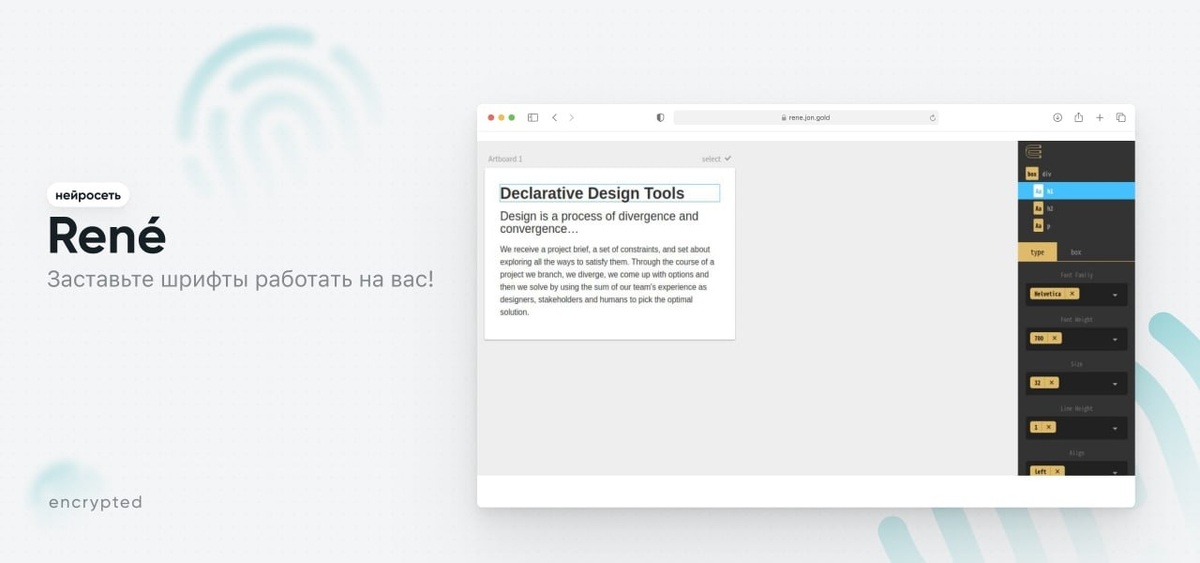 Как подобрать шрифты Веб-программисты часто верстают сайт по шаблонам от дизайнера, но когда этот шаблон оказывается повреждённым программисту приходится выкручиваться. Однако глаз совсем не заточен на дизайн, поэтому проблема с перебором шрифтов застаёт врасплох. René — нейросеть в лице сайта, которая поиграет со шрифтами за вас. Её создал разработчик Джон Голд из Airbnb и TheGrid. Он считает, что программой может пользоваться только продвинутый пользователь, но как показывает практика, то на деле и средний в ней легко разберётся спустя пару десятков кликов. Работа René построена на машинном обучении — с каждым новым подбором программа учится понимать принципы сочетания шрифтов. Нейросеть помогает дизайнерам и разработчикам экономить время и составлять подборки шрифтов для разных проектов. Интерфейс довольно прост и интуитивно понятен человеку, который сталкивался со шрифтами хотя бы пару раз в своей жизни. Справа расположена панель инструментов, на которой можно выбрать нужный