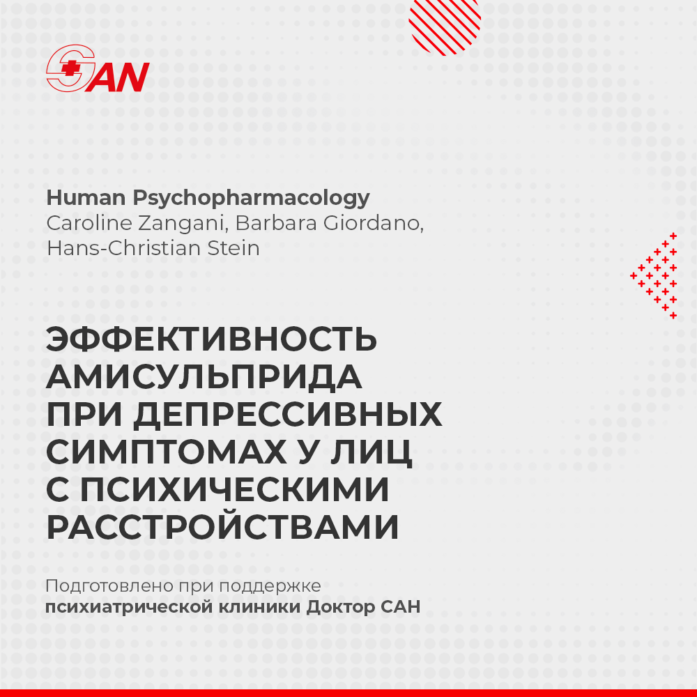 Депрессивные симптомы возникают при многих психических расстройствах, часто при отсутствии официального диагноза депрессии. В метаанализе оценивалась эффективность и переносимость амисульприда, как в качестве монотерапии, так и в качестве дополнительной терапии, при лечении депрессивных симптомов у лиц с любым серьезным психическим расстройством.