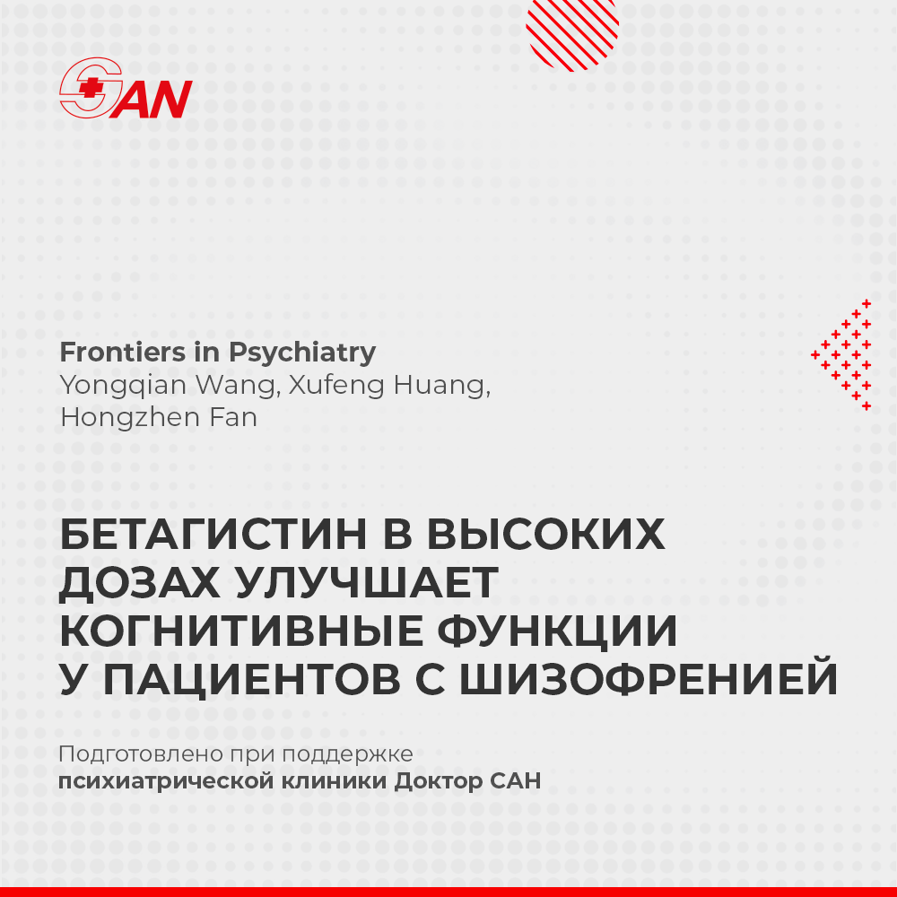 В настоящее время не существует эффективного лечения когнитивных нарушений, связанных с шизофренией. Недавние исследования показали, что повышенный уровень гистамина в головном мозге может помочь улучшить когнитивные симптомы при шизофрении. Бетагистин является агонистом H1-рецепторов и антагонистом H3-рецепторов. В рандомизированном двойном слепом плацебо-контролируемом испытании приняли участие 89 пациентов с шизофренией, которым случайным образом давали бетагистин (72 мг/сут) или плацебо в течение 12 недель. По сравнению с группой плацебо, группа бетагистина показала значимое улучшение общего балла по MATRICS Consensus Cognitive Battery (MCCB) после 12 недель лечения, а также улучшение отдельных параметров MCCB вербального обучения и визуального обучения. Тем не менее, не было значимого улучшения общих баллов или баллов по отдельным шкалам PANSS. В целом лечение высокими дозами бетагистина считалось безопасным для пациентов с шизофренией.