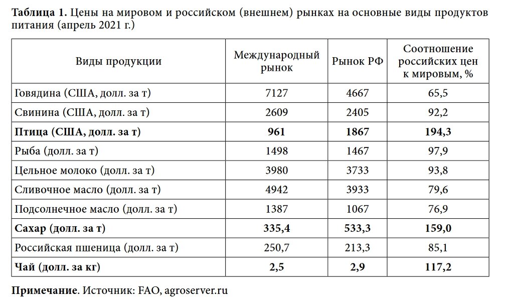 «Цены на российском рынке на товары, которые мы экспортируем или импортируем по таким позициям, как мясо птицы, сахар, чай значительно выше мировых, например, по мясу птицы в 2 раза, по сахару в 1,6 раза. По свинине, рыбе, молоку, пшенице цены на российском (внешнем) рынке практически соответствуют ценам на мировых рынках, лишь совсем немного уступая им.