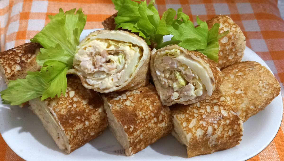 Доброго времени суток! Предлагаю приготовить простое блюдо из доступных и недорогих продуктов. Вкус этой закуски порадует. Что нужно : Приготовление : Выпекаю блинчики или можно купить готовые. Натираю сыр на мелкой тёрке и добавляю в него измельчённый чеснок. Нарезаю тонкой соломкой ветчину Добавляю майонез,перчу, солю и хорошо всё перемешиваю. Блинчики смазываю острым соусом, сверху кладу листья салата или пекинской капусты. Поверх капусты выкладываю сырную массу, распределяя равномерно по всей поверхности блина, можно посыпать измельчённой зеленью. Сворачиваю блинчики плотно в трубочки. Разрезаю блинчики на несколько частей и выкладываю на плоское блюдо. Подаю на стол. Приятного аппетита! До встречи на моём канале. Ставьте лайки, пишите комментарии, подписывайтесь на мой канал.