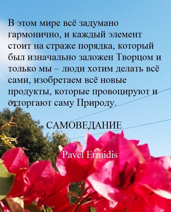 В этом мире всё задумано гармонично, и каждый элемент стоит на страже порядка, который был изначально заложен Творцом и только мы – люди хотим делать всё сами, изобретаем всё новые продукты, которые провоцируют и отторгают саму Природу.