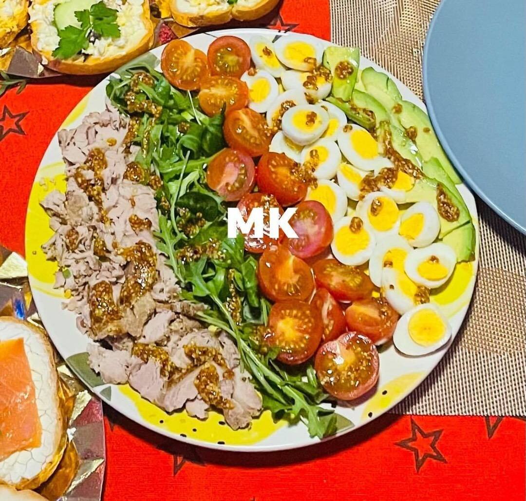 #презентація Ингредиенты: печеного м’яса або шинки чи бекону обсмаженого, перепелиних варених яєць, помідорів чері, руколи, авокадо, дор блю за бажанням, Соус , гірчиці в зернах, оливкової олії, лимонного соку, соєвого соусу, меду за бажанням) Способ приготовления: Всі інгридієнти порізати та викласти вздовж тарілки. Для соусу змішати всі інгридієнти, полити щедро салат. Смачного!