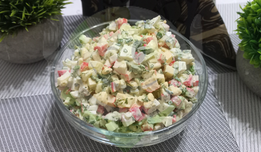 Салат "Море волнуется раз" готовиться просто, быстро и из доступных продуктов. Его можно приготовить как для семейного обеда, так и подать на праздничный стол. Ингредиенты: Крабовые палочки.................200 г Яйца варёные...........................4 шт Огурец .......................................1 шт Лук зелёный ...................1/2 пучок Укроп.................................1/2 пучок Майонез ............................по вкусу Соль ....................................по вкусу Приблизительная пищевая ценность салата (на 100 грамм): Калории: 168.94 ккал. Белки: 6.59 гр. Жиры: 13.72 гр. Углеводы: 4.52 гр. Приготовление. Крабовые палочки нарезаем небольшими кусочками. Рубим варёные яйца. Зеленый лук мелко режим. Измельчаем укроп. Огурец натираем на крупной тёрке и отжимаем лишний сок. Солим по вкусу и заправляем майонезом. Майонезом заправляем перед самой подачей, иначе огурцы пустят сок. Такой салат можно подать и порционно. Положите на блюдо формовочное кольцо, выложите салат