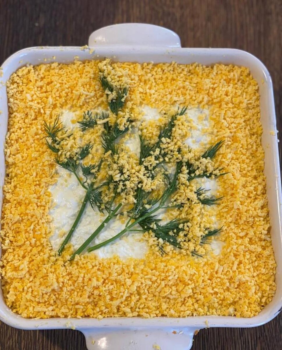 В салатницу укладываю горбушу, на нее — картошку, смазываю майонезом. Сверху — сайру, морковку, яичные белки, снова немного майонеза и зеленый лук. На него — желтки.