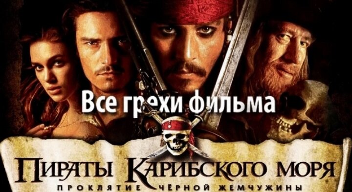 Пираты карибского моря проклятие чёрной Жемчужины это одна из 5 частей. Полнометражный фильм студии Walt Disney Pictures Я думаю многие из вас смотрели этот фильм где:рассказывается история о проклятом ацтекском кладе и о команде пиратов, которые имели несчастье навлечь проклятие на себя. Кому тогда повезло, так это главному герою — капитану Джеку Воробью: именно он возглавлял команду «Черной жемчужины» на пути к острову с сокровищами, однако против него был поднят бунт, и Джек оказался высажен на необитаемом острове, тем самым избежав ацтекского проклятия. В этой статье я хочу вам показать и рассказать о 10 грехов этого фильма 1.первые не состыковачки мы уже видим с первых кадров. Когда Джек Воробей плывёт к пристане в одном кадре середина дня А в другом уже явный закат 2.утонувшая лодка осталось бы на месте,не в силах преодолеть огромное сопротивление воды,но эта неудержимая прёт вперёд как субмарина. 3.я падаю в обморок от тугого корсета поэтому лезу к самому краю обрыва без пе