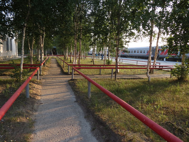 От Ноябрьска до Когалыма около сотни километров, пара часов пути - но единственным общественным транспортом остаются поезда Югорской магистрали: автомобилизация тут зашкаливает, так что с автобусами в Югре в принципе очень негусто. Разделяющие ЯНАО и ХМАО Сибирские увалы глазу почти не заметны, но этой холмистой гряды вполне достаточно, чтобы приехав из Ноябрьска в Когалым, почувствовать себя на благодатном юге. Усайдингованный вокзал служит по совместительству и автовокзалом - дежурная официально продаёт билеты, а практически от крыльца отходят маршрутки в Сургут. Я этого не знал, думая, что автовокзал на другом конце города, и потому таскался по Когалыму с 20-килограммовым рюкзаком на спине - это то, чего мне бы очень не хотелось повторять. Впрочем, я и прибыл сюда в пол-шестого утра, так что и на вокзале сдать рюкзак скорее всего было бы некуда. Когалым состоит из двух ярко выраженных частей в нескольких километрах друг от друга - Поселковой и Городской. Как пристанционны