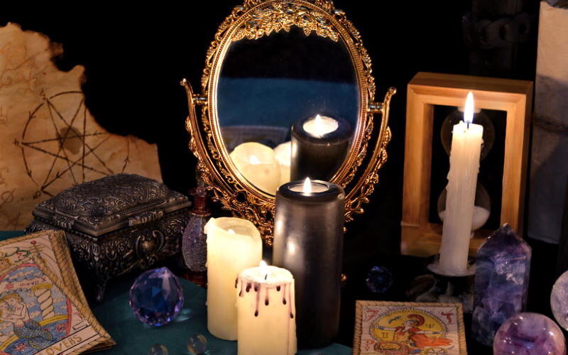 Считается, что самое действительное гадание в зеркале совершается на дворе при лунном сиянии, во время святочных вечеров. Лучшим временем для этого гадания признается полночь. Гадание на зеркалах производят только самые смелые девушки, которым более осязательно и более серьезно хочется познакомиться со своей будущностью. Гадание в зеркале или наведение зеркал всегда сопряжено с тишиной и молчанием, а вместе с тем с безлюдностью. Способов гадания на зеркалах много. Вот некоторые из них: В последнем зеркале этого коридора должен отражаться загадываемый предмет. Особа, севшая гадать, должна смотреть пристально и неподвижно. Время для этого гадания определить нельзя. Можно просидеть далеко за полночь и ничего не увидеть, но, вообще, перед началом видения зеркало тускнеет, свечи также теряют свой первоначальный свет. Суженый, вызванный поневоле этим гаданием, должен прийти в гадательную комнату и посмотреть в зеркало через плечо своей суженой. Суженая рассматривает все черты лица, одежду и