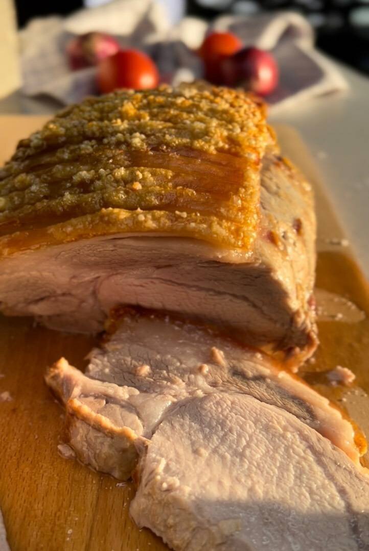 Это традиционно датская свинина Flæskesteg 🇩🇰 Ингредиенты: Свинина на шкуре, Лавровый лист, Соль, вода Способ приготовления: Шкуру свинины разрезать до конца. Выложить на противень шкурой вниз. Залить водой так,чтобы полностью покрыло шкуру. Запекать 15 минут при 180 градусов. Мясо достать и дать не много остыть. Щедро посолить. Соль втирать в шкуру между разрезами. Выложить лавровый лист между разрезами. И переложить мясо на решётку. Запекать 1 час при 180 градусов. Для хрустящей корочки: обязательно переключить на режим гриль 230 градусов и запекать ещё 12-15 минут. Мясо подавать горячим. Но и холодное оно тоже вкусное.
